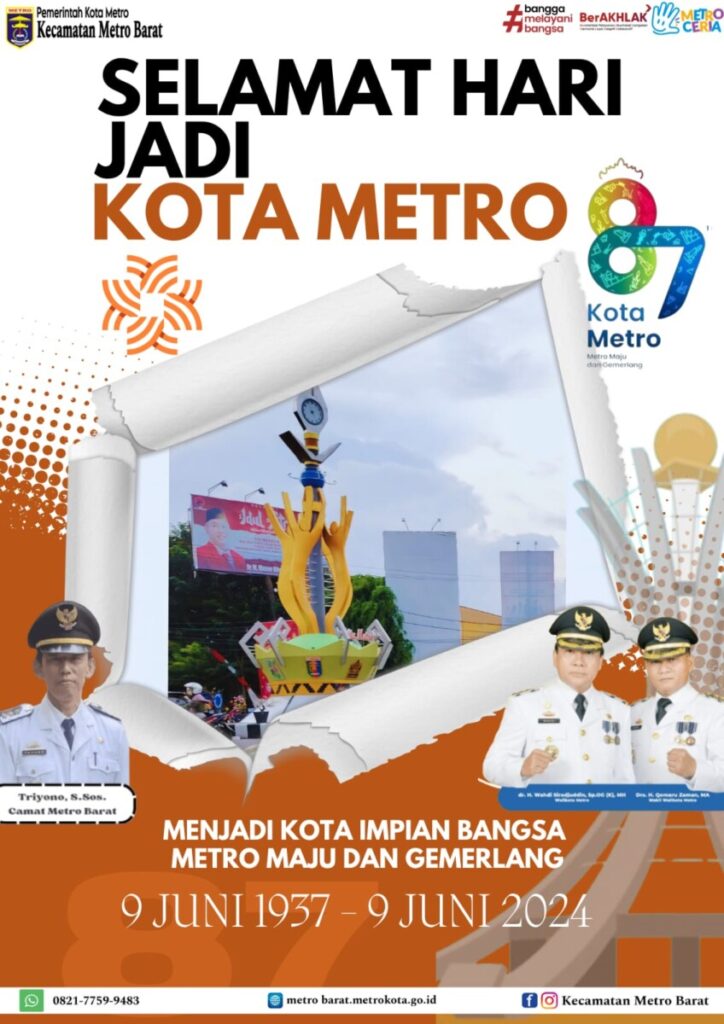 Dalam peringatan Hari Jadi Kota Metro kali ini, Kecamatan Metro Barat mendapat bagian melaksanakan upacara peringatan ini di Taman Makam Pahlawan Kemala Nusantara Kota Metro pada hari yang dipimpin oleh Sekda Kota Metro, Bangkit Haryo Utomo. Peringatan Upacara ini dilaksanakan bersama Asisten Pemerintahan dan Kesra sekda Kota Metro, Dinas Pertanian, Kecamatan Metro Barat, Kelurahan Se-Kecamatan Metro Barat.