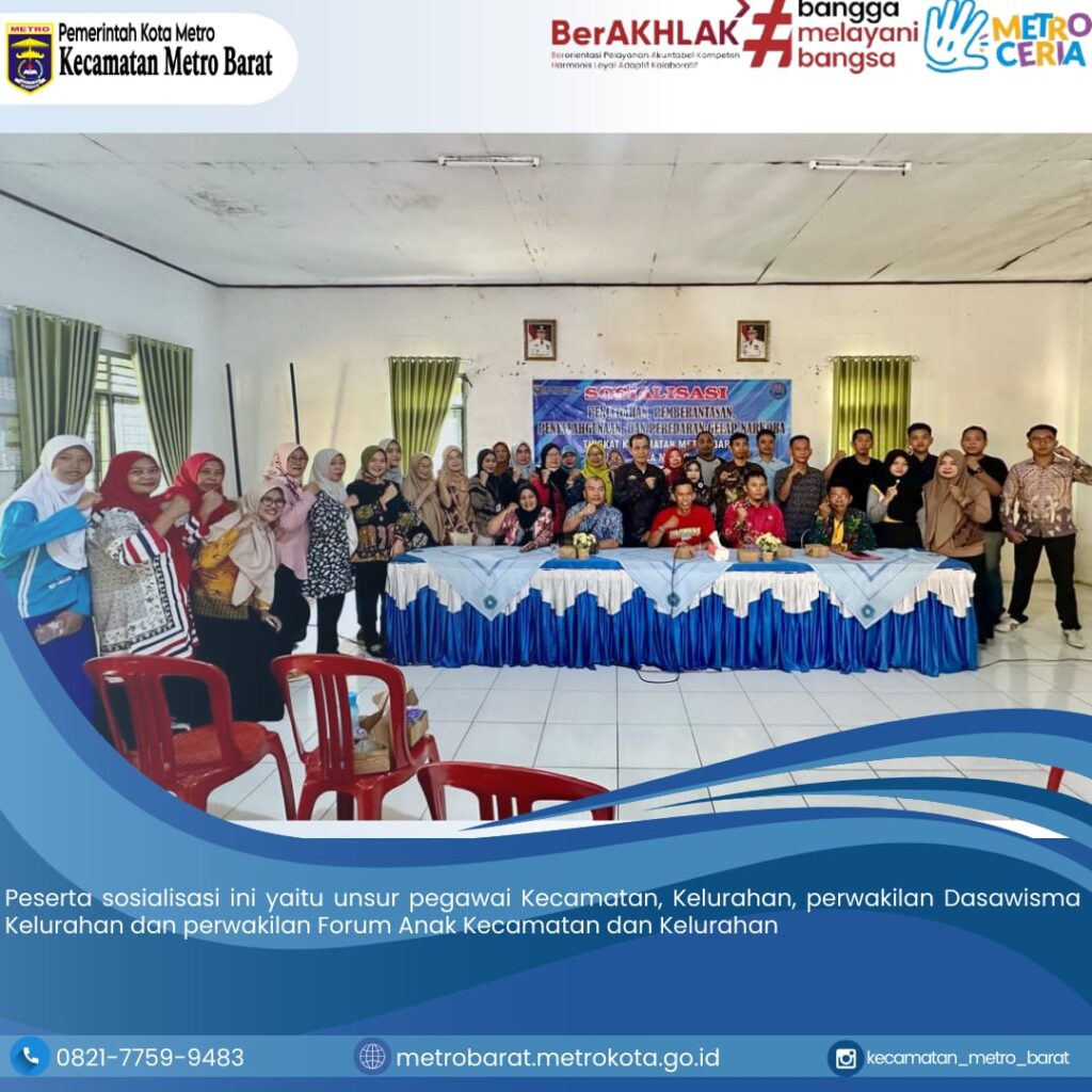 Kegiatan sosialisasi P4GN (Pencegahan, Pemberantasan, Penyalahgunaan, dan Peredaran Gelap Narkoba) yang diselenggarakan oleh BNN Kota Metro pada 4 Oktober 2024 di aula Kantor Kecamatan Metro Barat berlangsung dengan sukses. Acara ini dihadiri oleh berbagai elemen masyarakat, termasuk pegawai kecamatan, pegawai kelurahan se-Metro Barat, anggota dasawisma, dan perwakilan forum anak.